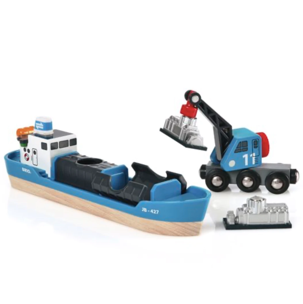 Aye aye Captain! Transport the cargo from water to dry land with this container ship. Use the moveable crane to crank up the loads and place them on any BRIO train wagon.
