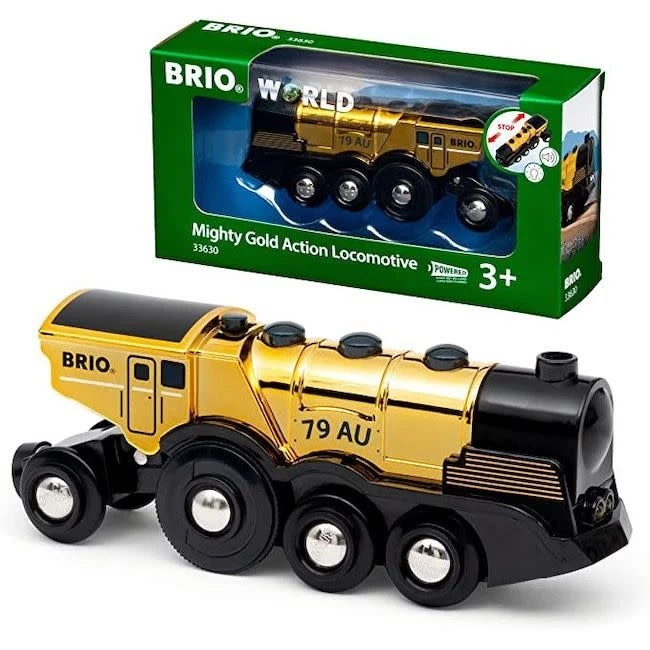 The BRIO train can run at high speed on batteries, but it can also be switched off with a button on the top, so you can run freely with the train. It lights up and says cool light effects, and at the back it has a magnet so you can put carts etc. after the train.