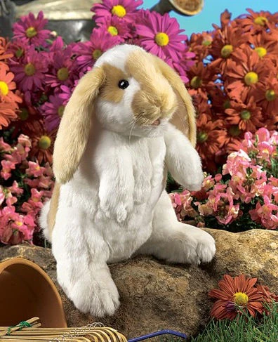 Look who just popped up in the garden ready for the next harvest! New to the bunny hutch is the Standing Lop Rabbit puppet featuring distinctive long ears and cashmere-soft fur in a creamy white and “broken” brown color pattern. A hip “localvore” who’s ready to feed on fresh veggies, this cuddly fellow can hold a carrot up to his hungry, open mouth and nibble away. Adopt this sweet natured creature before he hops away!