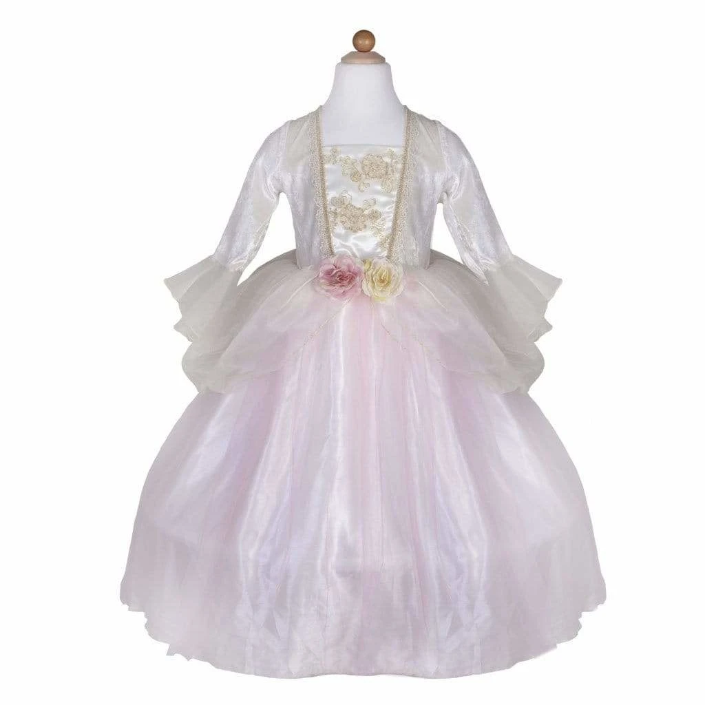 This absolutely stunning and elegant dress is designed with great attention to the finest details. The soft and silky skirt has a hoop and a shimmery top layer with a sparkly peplum. The crushed velvet bodice has a satin inset embellished with gold embroidery and finished with fancy golden trims. Elasticized waistband is adorned with pink and champagne-colored roses at the front.ย This gown is dreamy and itโs dream come true for all little princesses!