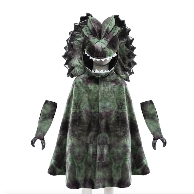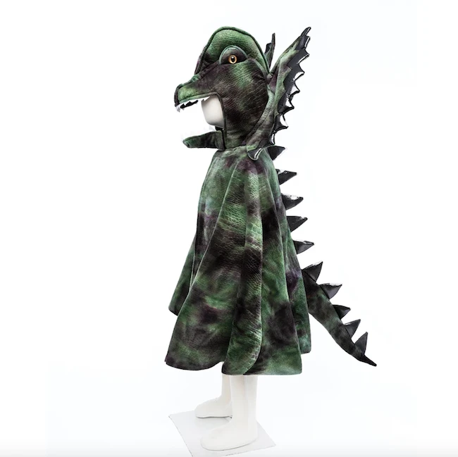 Does your Triceratops or T-Rex need a friend? Your child will love this super cute, totally monstrous dinosaur cape! This green, grey, and purple tie-dye cape is lined with black lining. Detailed with grey and purple metallic spikes down the back. The dinosaur head has a removable mouthpiece to ensure a secure fit. This is a two-piece set – cape & claws included.