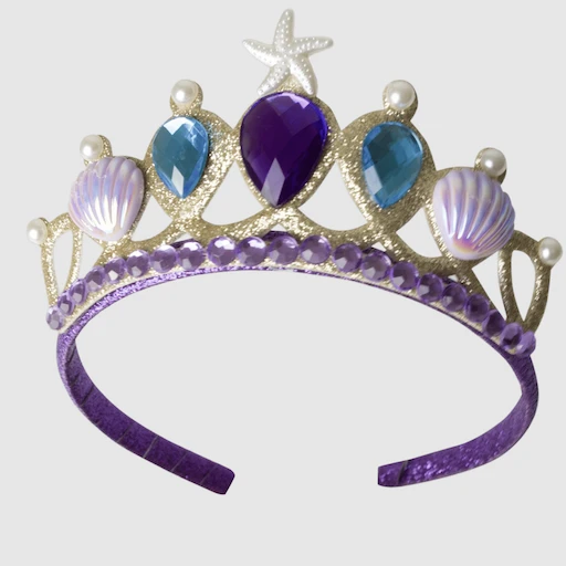 Mermaid Glimmer Skirt with Tiara is a magnificent 2-pc Set! The gorgeous mermaid skirt has extra fabric gathering and a wide elastic on the backside for added comfort and extra size flexibility. This skirt features holographic dimensional scales which make it shimmer and shine with every turn. With its iridescent foil print and shimmery soft organza fins, this skirt is a real gem, and yes, it is machine washable! The tiara is comfortable and flexible with a bit of bend to it. The band is covered in soft fabric and there is no pinching behind the ears. The gems are encased in golden frames and embellished with pearls and a starfish as its crown centerpiece. This set is beautiful and a fashionable way to be under the sea!