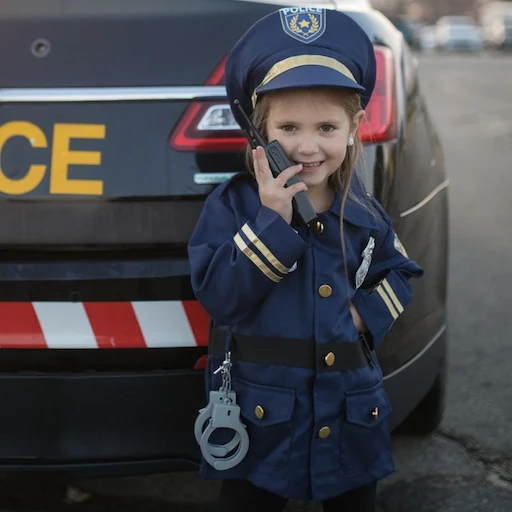 Police officer set includes: Jacket, Hat, Handcuffs, Walkie Talkie, Badge, and Name Badge. SKU: 81485