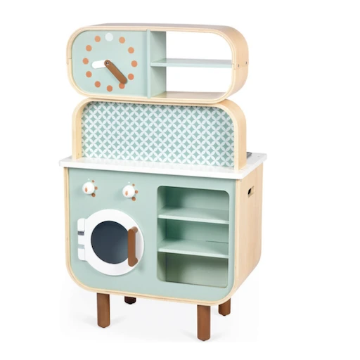 Soft colors, a unique and modern style combining lots of pretty features… Children will love this wooden kitchen! Perfectly equipped and double-sided, it offers many possibilities for playing, alone or with others. The double-sided kitchen Cooker Reverso is equipped with a functional clock, a metal sink and a sound and light induction hob. Just press the red buttons once to make the hotplates light up, then a second time to hear the sound of the water boiling. The sound and light automatically turn off after 30 seconds or when you press a third time. Like a real kitchen, it is equipped on one side with 2 rotary buttons with sound effects, an oven, a microwave, a cupboard with magnetic doors, and on the other side there are 2 buttons with sound effects, a washing machine and storage shelves. To complete this beautiful wooden kitchen, 7 metal accessories are included: 1 frying pan, 1 saucepan, 1 sieve, 1 spoon, 1 spatula, 1 slotted spoon, 1 pasta spoon, and finally 1 cloth potholder. Your little ones will have everything to make the best homemade dishes for you! Kitchen counter height: 50 cm.