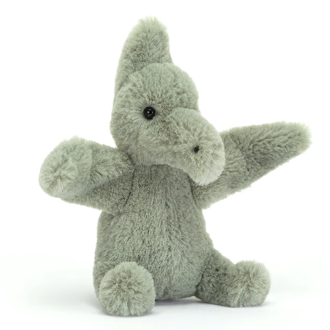 Fossily Pterodactyl is pleased as punch! After all, there’s nothing like swooping over the sea in search of a fishy supper. A prehistoric air ace in ivy green, with a funky crest and tiny tail, this softy of the skies will be right at home sharing a nest with you!