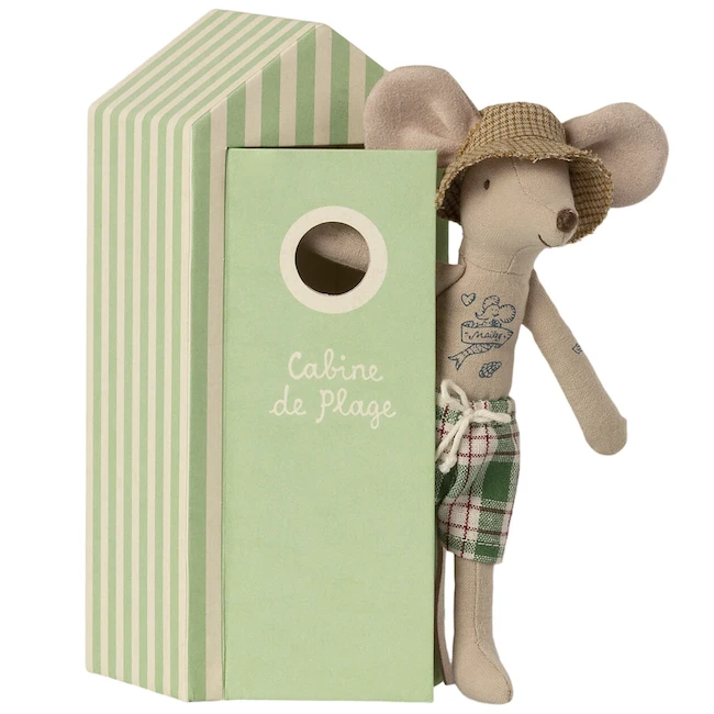 Summer vibes all-year-round with the Beach Mice, Dad In Cabin De Plage by Maileg! The beach mice include a cabin de plage for the dad to play change his swimsuit and more. Now your little one can play all summer long with these cute beach mice from Maileg.