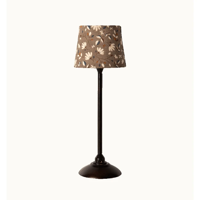 Our beautiful Maileg miniature floor lamp is a must-have. The lamp will light up the room with a soft tone – remember to turn off the light when our friends go to bed. The battery can be changed by an adult.