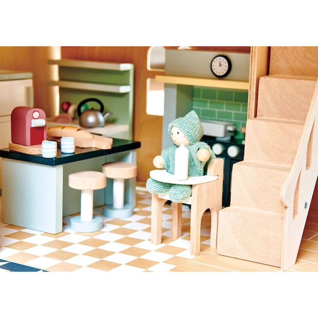 A Contemporary stylish kitchen set, with great attention to detail, Includes: island unit and 2 bar stools, A range style oven unit, fridge, butler sink unit, hand towel, kettle, fish pot, coffee machine with cups, 2 plates, recipe books, baguette on a chopping board, and a tray of freshly baked muffins. Suitable for all the wooden dolls houses, as scaled to 1:12. Age range: 3 Years And Older Product size: 9.84 x 6.69 x 5.91” Weight: 1.55 lbs