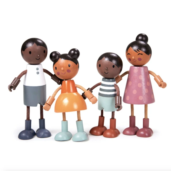 A multicultural poseable wooden family with flexible arms and legs for creative play. Set Includes Mum, Dad, little girl and little boy.