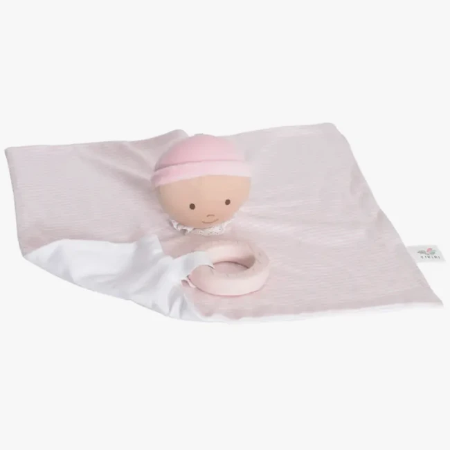 The Cherub baby comforter is an absolutely adorable choice for a new baby. The soothing comforter now comes with an attached natural rubber teething ring, so baby does not have to choose between the favorite comforter and teether and parents have one less thing to remember to take. All natural, soft and cuddly it is a guaranteed favorite for babies and parents. • Pink striped comforter & pink rubber teething ring with a pink baby hat and delicate printed features. • Soft head are great for snuggles. • Natural rubber teether is safe, easy to grip, soothing and gentle on gums. • Please refer packaging for further care and safety instructions.