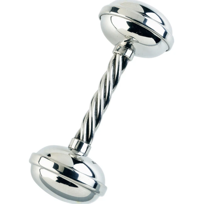 The pitter-patter of little feet brings the jingle jingle of little rattles.ย This fun and adorable pewter twisted handle dumbbell rattle is everything you want in a baby gift and more since itโs handmade right here in the U.S.A.